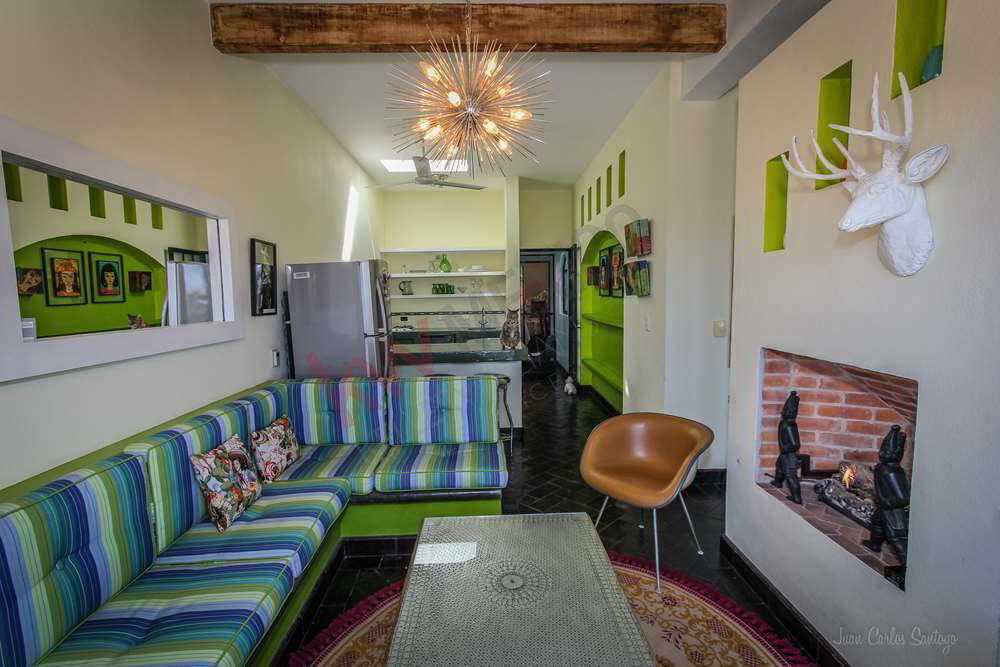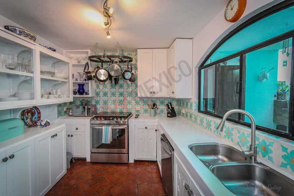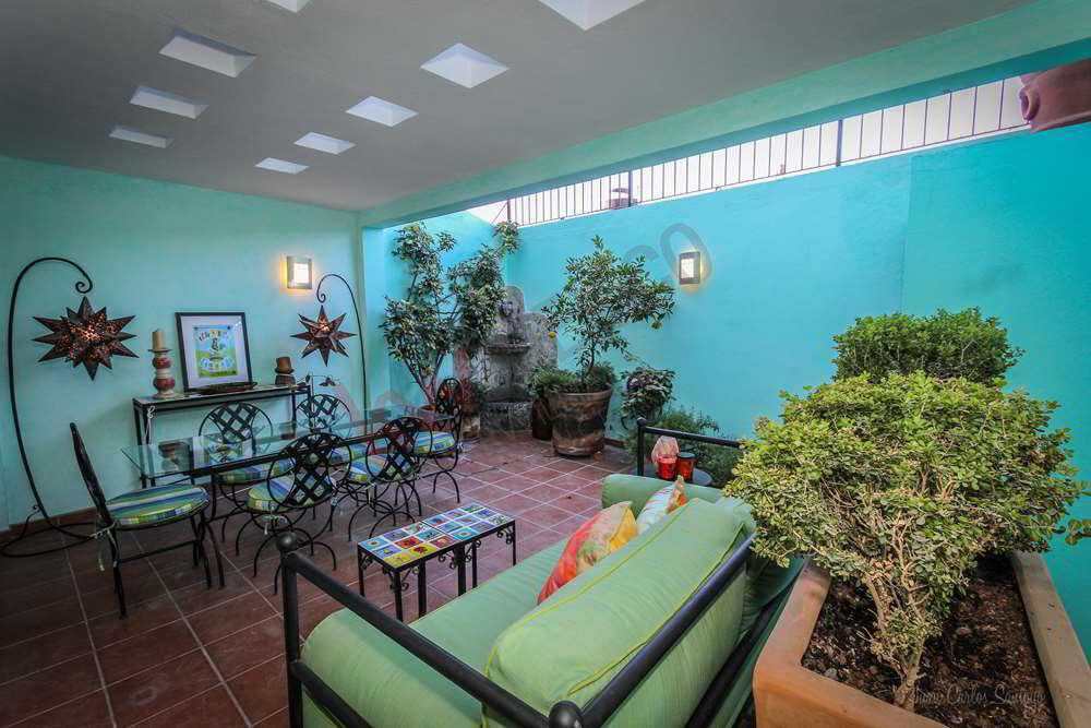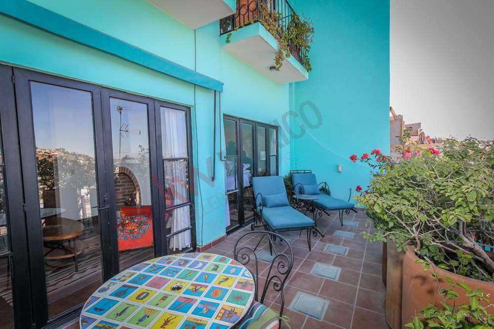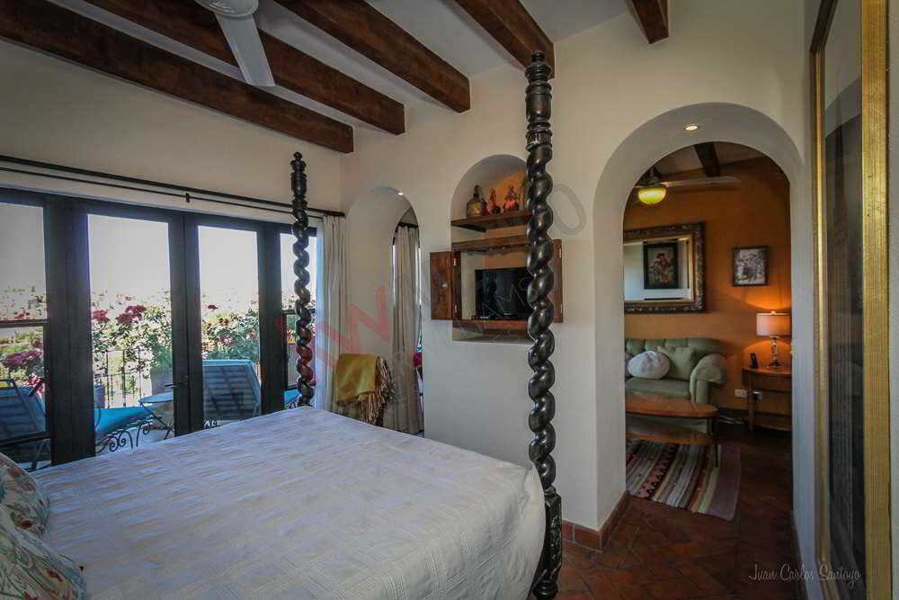 The second unit has two bedrooms and two baths and is located one level up from the main entrance. It is warm and inviting with its tall ceilings, wooden beams, and polished cement countertops. The bathrooms are Talavera tiled with the master bath including a hydromassage tub to soothe any care away. A Juliette balcony off the master offers incredible views and a wonderful place to relax.